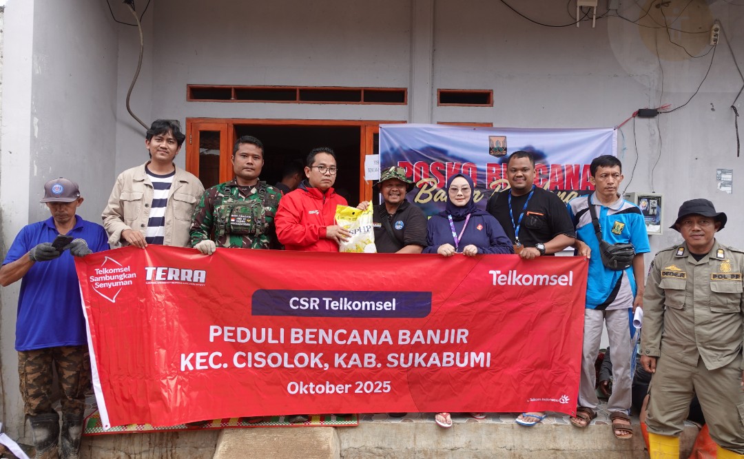 Sukabumi, – Telkomsel terus berupaya maksimal menunjukkan komitmennya dalam membantu masyarakat yang terdampak bencana alam, termasuk pada bencana banjir dan longsor yang melanda wilayah Cisolok, Sukabumi. Sebagai bentuk kepedulian terhadap warga terdampak bencana alam di Cisolok, Sukabumi, Telkomsel melalui program TERRA (Telkomsel Emergency Response & Recovery Activity) bergerak dengan memberikan bantuan berupa paket bahan pokok pangan, makanan siap saji, tenda pengungsian, perlengkapan sekolah hingga bantuan komunikasi kartu perdana SIMPATI yang diserahkan secara langsung kepada warga terdampak bencana Cisolok, Sukabumi, Kamis (30/10).