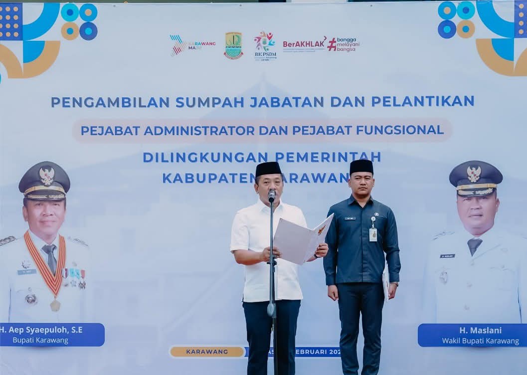Karawang -Bupati Karawang, H. Aep Syaepuloh, SE merampungkan rangkaian penataan struktur organisasi melalui pengambilan sumpah jabatan dan pelantikan pejabat di lingkungan Pemerintah Daerah Kabupaten Karawang pada Selasa (03/02) di Kantor Disdukcapil Karawang.