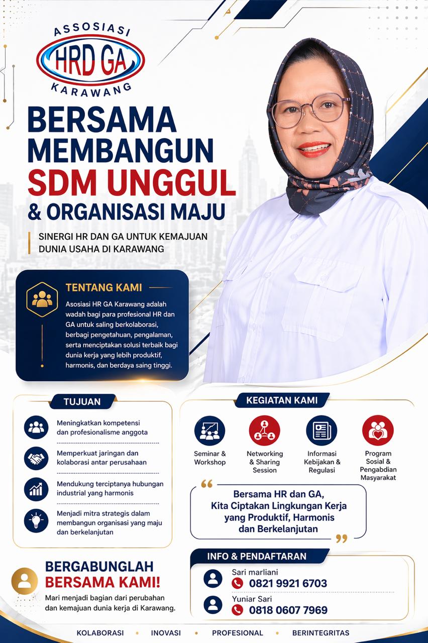 Karawang — Asosiasi HR-GA Karawang (ASOKA) terus menunjukkan geliat positif dalam mendorong kemajuan dunia usaha, khususnya di wilayah Karawang dan sekitarnya. Di bawah kepemimpinan Sari Marliani, ASOKA berinovasi dan memperkuat peran strategisnya sebagai wadah kolaborasi para praktisi Human Resources (HR) dan General Affairs (GA).
